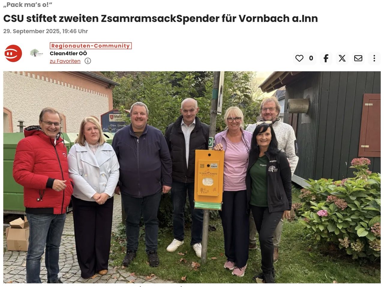 Die Initiative Clean4tler aus Oberösterreich war bei der Enthüllung des neuen Zsamrasack-Spenders in Vornbach, ein Gemeindeteil der Gemeinde Neuhaus am Inn mit dabei.
